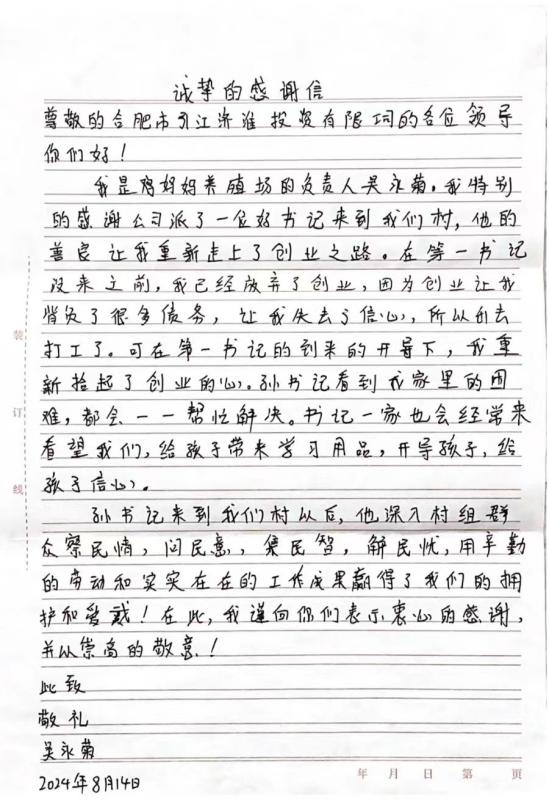 “孫書記看到我家里的困難,都會一一幫忙解決,孫書記用辛勤的勞動和實實在在的工作贏得了我們的擁護(hù)和愛戴!”近日,長豐縣莊墓鎮(zhèn)棗林社區(qū)村民吳永菊,在給公司第八批選派干部,時任棗林社區(qū)第一書記的孫玉同志的感謝信中這樣寫道。她對市引江投資公司一直以來的關(guān)心幫助,和駐村書記孫玉同志三年以來的辛勤付出致以誠摯的感謝,并為公司和孫玉同志送上印有“為民選派好領(lǐng)導(dǎo) 盡心盡力辦實事”“黨的好干部 群眾貼心人”的錦旗。